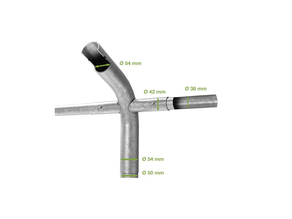 Spojky rámu z pozinkovaných trubek o průměru cca 54mm a tloušťce stěny 1,7mm (horizontální spojky průměr 42mm, tloušťka stěny 1,4mm).